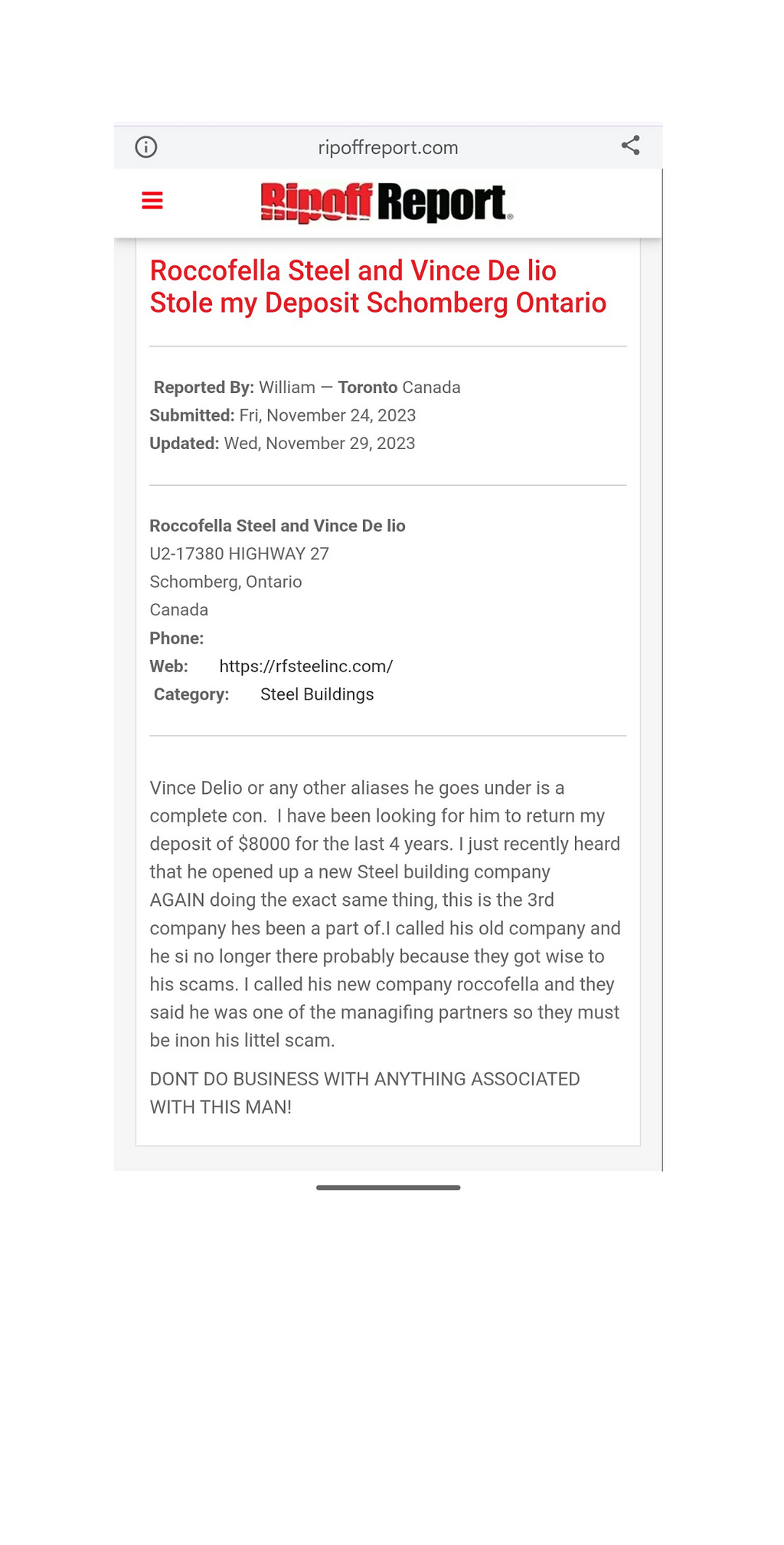 Review from a customer stating Vince De Lio, King City Steel's VP, stole $8K in deposits and no service delivered.